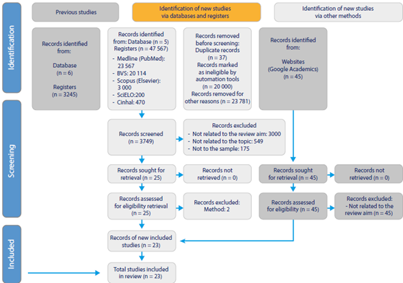 In the second step, which was done in February 2023, the search strategy, including all the keywords and indexing terms identified, was adapted for each database and/or information source included. The search strategy was tested by two reviewers. The following databases were included: Medline (PubMed), Web of Science, Scientific Electronic Library Online (SciELO), VHL, Scopus, Cinahl, and Google Scholar in the gray literature (Table 2). The reference list of all the evidence sources included was examined for additional studies in April 2023. The third stage was done between March and May 2023, with the extraction and analysis of data from all the selected studies.