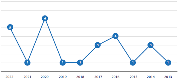 Of the 23 studies selected, 6 were published in 2020; 3 were published in 2022; followed by 4 studies in 2016; 3 studies in 2014 and 2017; 2 studies in 2022; and only 1 study was published in each of the following years: 2013, 2015, 2018, 2019, and 2021 (Figure 2).