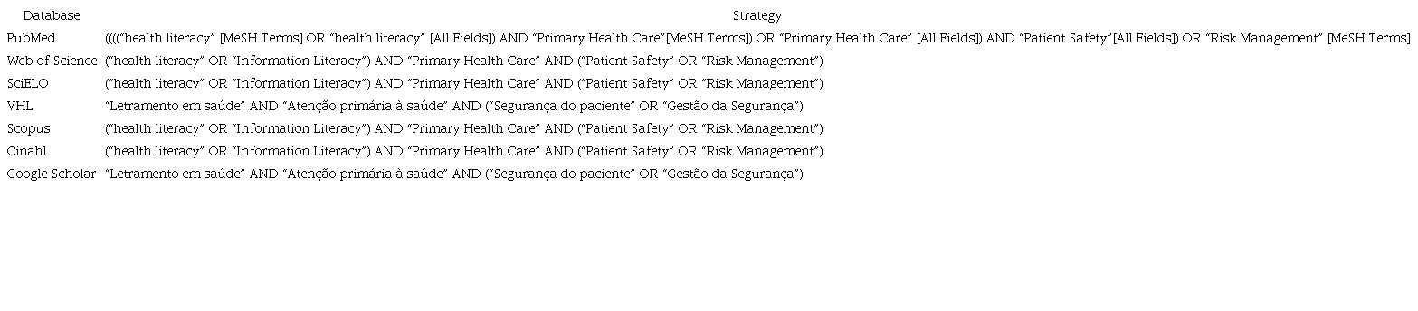 The PCC strategy was used to draw up the research question in which: Population refers to studies where the participants were users of PHC services, in this case, adults who received health care (excluding studies where participants received home care); concept refers to studies that addressed care, techniques, protocols, or health literacy methods used to improve health care; context refers to studies on patient safety, patient engagement and/or self-management in PHC. Patient safety entails not subjecting the user to avoidable risks resulting from the care or assistance provided, as well as preventing any complications (7). Thus, all studies that addressed this context along with the concept and participants described above were included in the search.