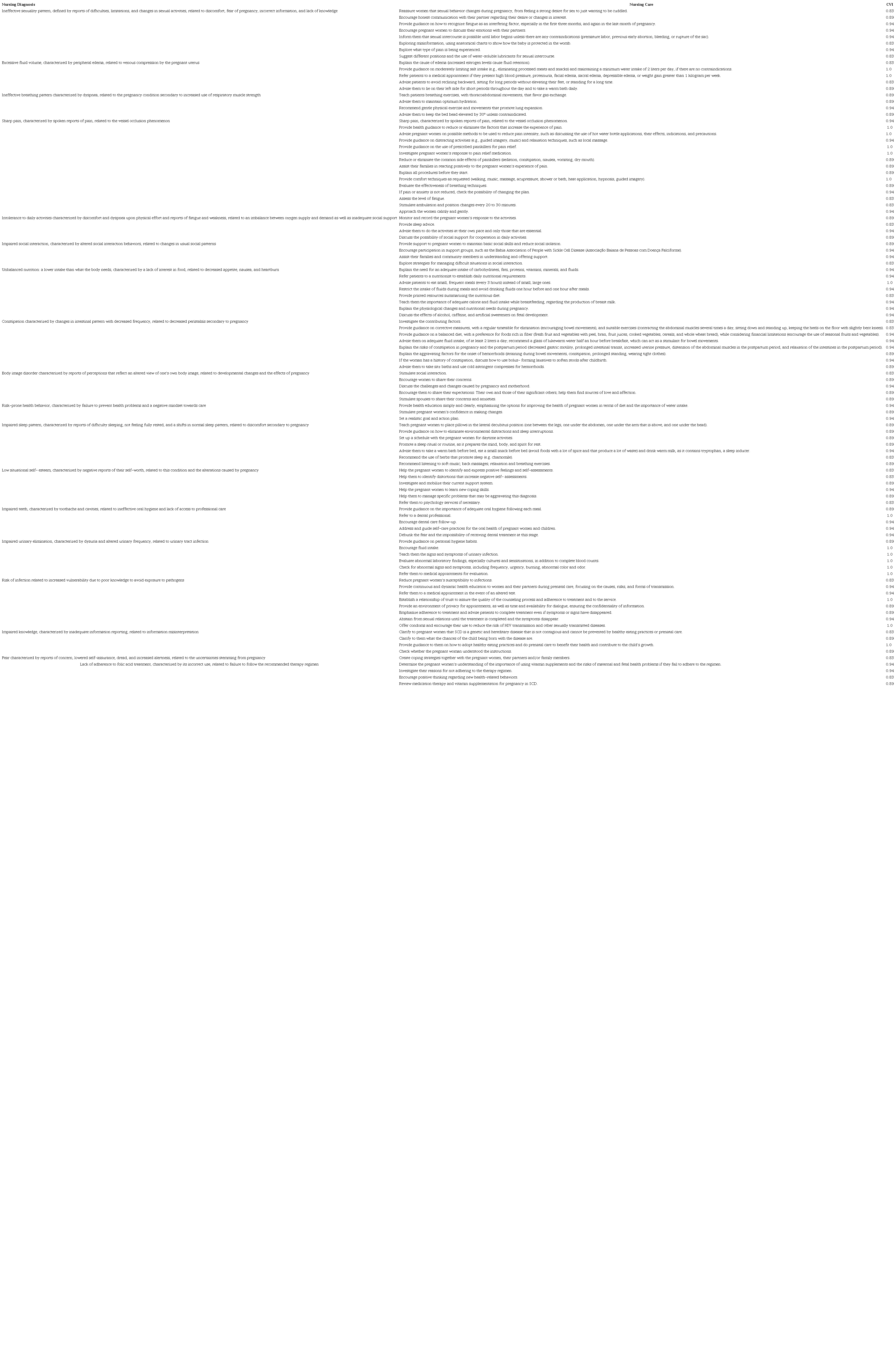 Most participants were working in teaching, research and extension (61.11 %), and/or in outpatient clinics specializing in providing care to people with SCD (33.33 %), had between 1 and 5 years of professional experience (55.56 %), had experience with SCD in care (61.11 %), and in teaching and research (61.11 %). The level of training ranged from undergraduate (22.22 %), to specialization (33.33 %), residency (5.56 %), master’s (16.67 %), and doctorate (22.22 %). All the judges were living and working in the Northeast region of Brazil at the time of the study. Regarding content validation, the nursing diagnoses and nursing care that comprised the instrument and had a CVI higher than 0.80, as rated by the judges, are described in Table 1.