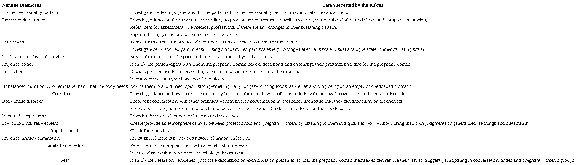 The use of this instrument in care practice by the nursing team should be the guiding object of nursing actions, but it is worth considering the importance of the individuality and integrality of care for pregnant women with SCD. These pregnant women have specific characteristics stemming from the disease that require special attention, as highlighted by the judges in the study when they recommended referral to the psychology service as a nursing intervention. This recommendation can be understood by the frequent occurrence of spontaneous abortion in pregnant women with SCD (10, 34) and the increased risk of maternal death due to exacerbated complications during pregnancy and puerperium (4, 6, 35).