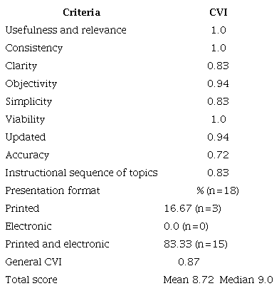 Content validity consists of an evaluation performed by specialist judges who determine whether an instrument measures exactly what it is intended to measure (19). In instruments for use in research and/or clinical practice, validity is an essential attribute.