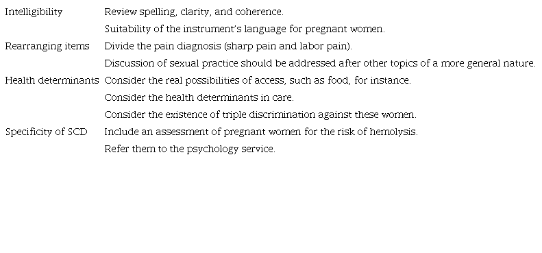 Conclusiones: se destaca el potencial del instrumento, que puede ser perfeccionado a través de su utilización como recurso para orientar las prácticas de enfermería dirigidas a gestantes con anemia de células falciformes, tanto en la atención primaria de salud como en la red hospitalaria.