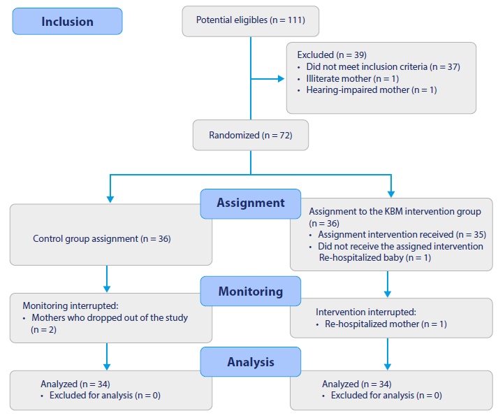 Mother-kangaroo baby pairs were randomly assigned to either group to prevent measurement bias. A biostatistician used computer-generated sequences through Stata to create a simple randomization scheme in blocks of size four. This resulted in 34 pairs in the KBM intervention group and 34 pairs in the kangaroo position control group without massage. To ensure blinding, sealed dark envelopes marked with codes from 1 to 68 were used, each corresponding to a consecutive assignment number. Inside each envelope was a slip indicating group assignment: A red slip for the KBM group or a blue slip for the control group. Additionally, the envelope contained information about the nurse responsible for conducting the tele-consultation. The opening of the envelopes was witnessed by the mother and an independent observer to maintain transparency.