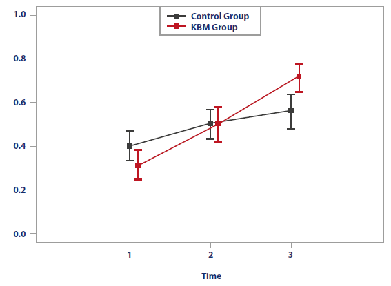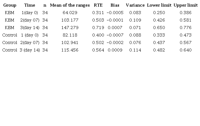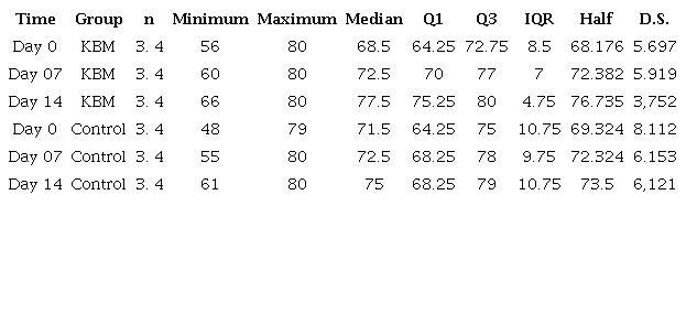Figure 2 shows the significant difference between groups, displaying better results in the total score of the mothers who applied the KBM at time 3 (day 14).