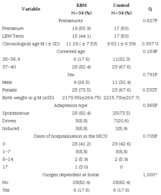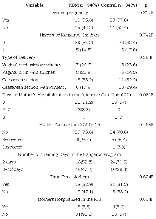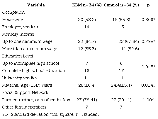 The baseline data were homogeneous in the two groups (KBM vs. control), except for maternal age, finding that mothers in the KBM group were older (28 ± 6.4) than the mothers in the control group (24 .4 ± 5.1) (p=0.014). These data are presented in Tables 1, 2 and 3, corresponding to sociodemographic aspects, maternal history, and perinatal characteristics.