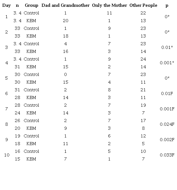 Table 4 presents the family support received by mothers in the KBM group, where a family member (typically the father or grandmother) took over kangarooing duties, allowing the mothers to rest. This support showed statistically significant differences over the days (p<0.05). In contrast, mothers in the control group generally performed kangaroo care alone. Table 5 shows that there were no statistically significant differences between the two groups (p>0.05) concerning the maternal perception expressed in the statement, "I am good at kangarooing my baby."