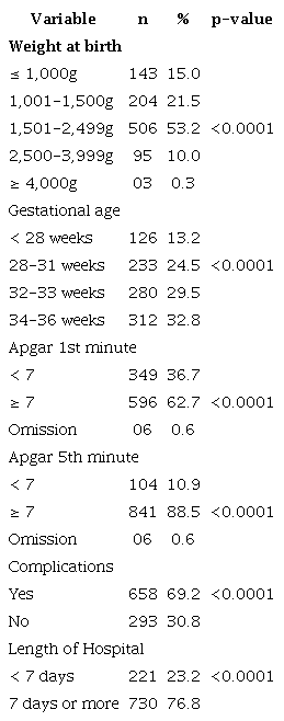Variables: Peso al nacer, edad gestacional, puntuación de Apgar, complicaciones y duración de la estancia hospitalaria a partir de 951 registros de niños prematuros hospitalizados; 18 madres fueron entrevistadas durante la hospitalización, 15 días después del alta en el domicilio, 30 días después de esta visita domiciliaria y a la edad de 6 meses del niño, por teléfono, en el sur de Brasil.