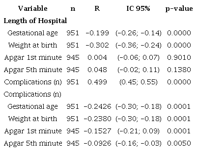 The prolonged hospitalization time of premature children was correlated with lower gestational age, low birth weight and a greater number of complications. In the same way, the high number of complications with lower gestational age, low birth weight and prolonged hospitalization (Table 2).