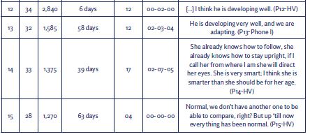 She's gained more weight, she's stronger, she's smarter. She follows us with her eyes a little, acts a little more in the morning and cries. (P2 - Phone I)She's breastfeeding, I make her burp, she burps well. Then I spend a few minutes and she starts to get irritated, squeezes herself [...]. They said that it may be reflux that is causing it. (P18-HV) He needs to be monitored by the cardio pediatrician due to a complication during the hospitalization period, endocarditis. (P13- Phone I) [... ] we had to come back because of the inguinal hernia, and we stayed in the hospital for almost a week. (P13-HV)