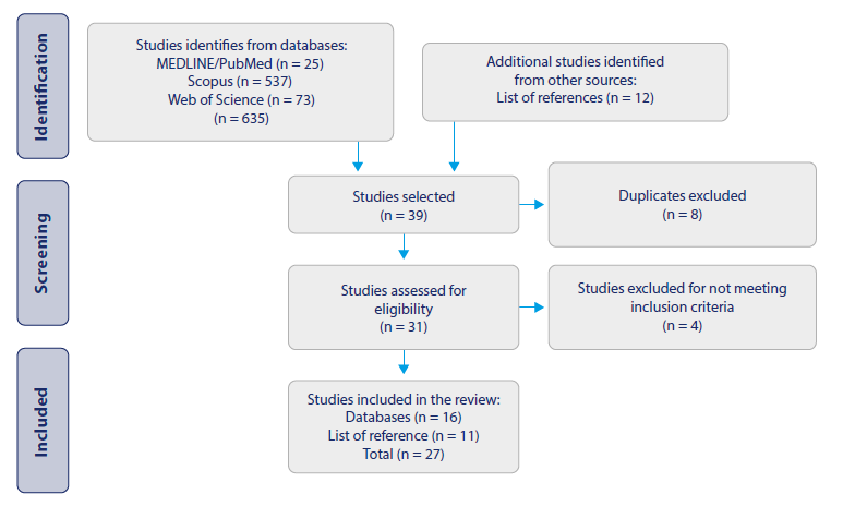 The search yielded 635 studies, of which 31 were selected for comprehensive review. Among them, eight were excluded due to duplication, and, upon detailed review, four more were excluded for failing to meet the selection criteria. This resulted in a total of 19 articles. Further evaluation of the reference lists of these studies led to the inclusion of an additional 11 studies, composing a final corpus of 27 articles (Figure 1).