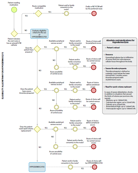 Introduction: Hypodermoclysis is an alternative method for administering medications and fluids. From this perspective, decision-making tools are useful for systematizing care.
