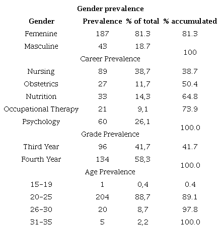 The sociodemographic data presented in Table 1 shows that, of the total population surveyed, 81.3% are female and the age range is mostly between 20 and 25 years, with 88.7%. On the other hand, the majority of respondents belong to the Nursing program, with 38.7%, where 58.3% are in their fourth year.