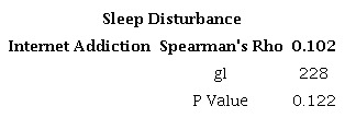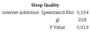 Regarding the correlation between Internet addiction and sleep quality, the data presented in Table 2 represent the connection of total sleep quality with Internet addiction (r=0.154 p=0.01), demonstrating that there is a correspondence weak positive between both variables.