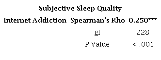 The data presented in Table 3 represent the relationship between subjective sleep quality and Internet addiction. The coincidence between these two variables is statistically significant (r=0.250 p=0.00) but weak.