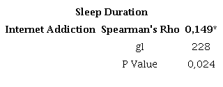 The data presented in Table 4 represent the relationship between sleep duration and Internet addiction. The proximity between these two variables is statistically significant (r=0.149 p=0.02).