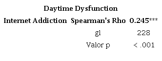 It was concluded there is a relationship between daytime dysfunction and Internet addiction in the sample studied. Statistical analysis indicated a Rho correlation coefficient of 0.24, indicating a weak positive correlation. Furthermore, the significance level was found to be 0.00, lower than the theoretical threshold of 0.05.