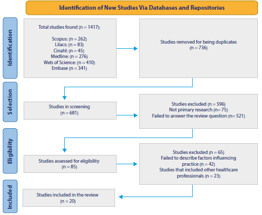 Initially, 1,417 records were found in the databases, of which 55 were selected for full analysis, following the established criteria. After rigorous evaluation, 20 primary studies were considered eligible and included in the final sample of this review. Figure 1 shows the steps in the selection process for the primary studies in this integrative review.