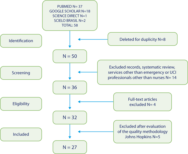Out of the 50 articles assessed, 14 were dismissed because they failed to meet the inclusion criteria. Four were discarded following a comprehensive read-through, leaving 32 articles for analysis using the Johns Hopkins Nursing Evidence-Based Practice tool. This tool allows for the identification of the type of evidence -whether quantitative or qualitative, as well as potential biases and the quality of the evidence. The tool features several sections; however, due to the systematic nature of the literature investigation, only sections E and G, which assess quantitative evidence, were considered. Section E appraised the purpose, bibliography, sample, instrument validity, results, and limitations of the selected articles.