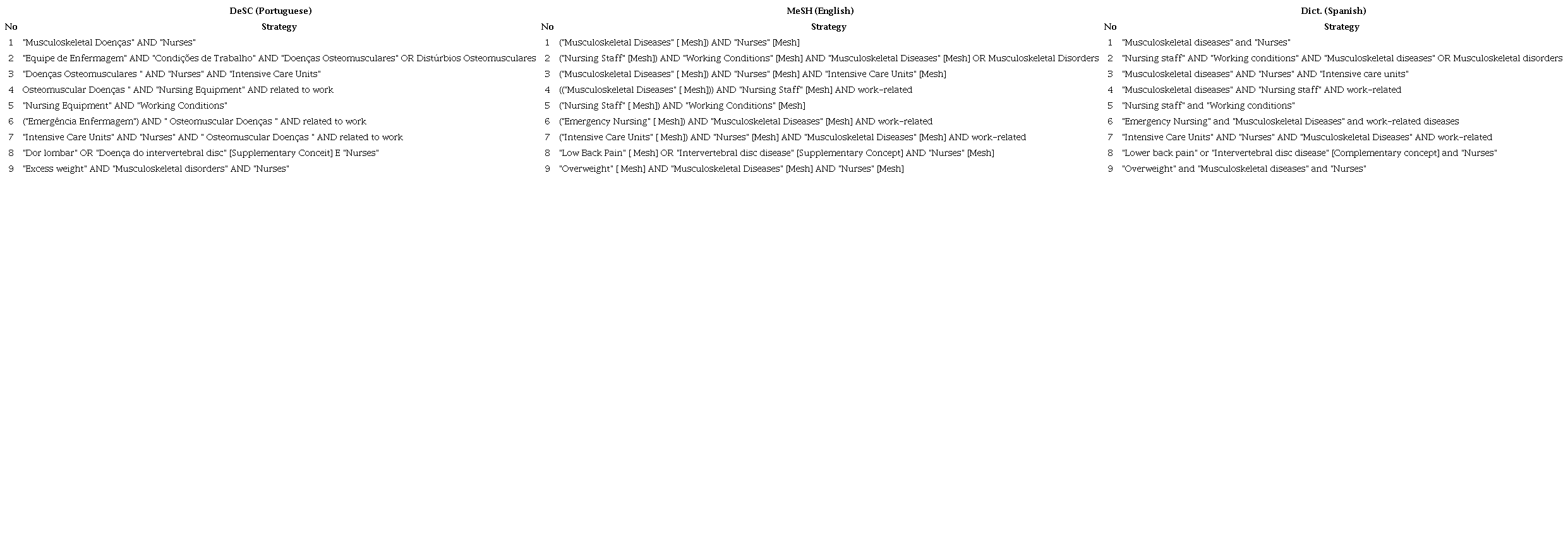 This study used a narrative approach and extracted information from the following databases: PubMed, Science Direct, Google Scholar, and the Scielo Electronic Library, in Portuguese, English, and Spanish. We developed search equations using the following terms: musculoskeletal diseases, nursing staff, working conditions, low back pain, intensive care unit, and emergency. These terms were combined using the Boolean operators: AND, OR, and NOT.