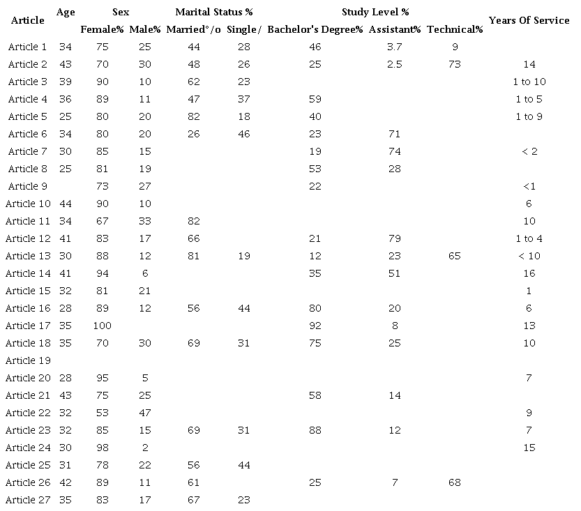 Concerning sociodemographic factors, the participants in each study were primarily women (more than 60%), with an average age ranging from 31 to 35 years. Most were married and held a bachelor's degree in Nursing, followed by a nursing assistant certification. As for their years of service, the vast majority had worked for less than 10 years.