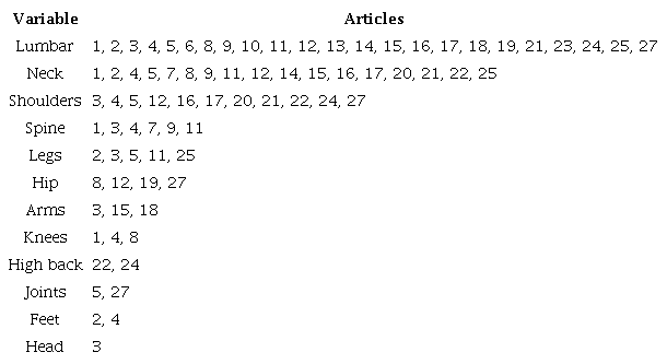 Results: The initial search generated 58 primary reviews, from which 27 met the inclusion and quality standards. The average age of the population ranged from 31 to 35 years, female sex, with a bachelor's degree academic level and less than 10 years of professional experience. The most affected body parts were the lumbar region, neck, and shoulders. Concerning the associated factors, there was a higher prevalence f of disorders due to repetitive mechanical movements and deficits in s the use of body mechanics.