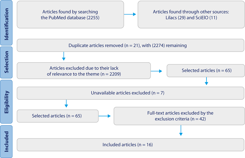 In total, 2295 articles were retrieved (2255 from PubMed, 29 from Lilacs, and 11 from SciElO). After removing duplicates and applying the inclusion criteria and analysis by title and abstract, 65 articles remained, of which 42 were excluded as they failed to meet the specific criteria after full reading of the entire material, while 7 were not available, which resulted in 16 articles that comprised this review.