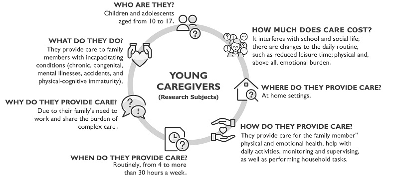 Individuals under the age of 18 who assume family care responsibilities beyond what is typically expected for their age and who perform activities usually attributed to adults are referred to as 'young caregivers' 1-3. Although no official numbers exist, it can be noted that several of these young caregivers find themselves tasked with providing care to a family member, especially parents, grandparents, or siblings, who have some condition that requires care, such as chronic and mental illnesses, disabilities, or physical-cognitive immaturity 1,4,5.