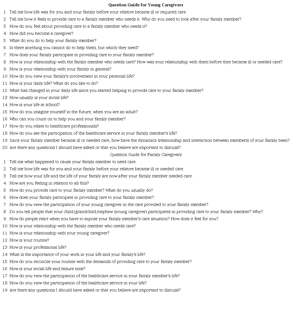 The research was approved by the Standing Committee on Ethics in Research with Human Beings of the State University of Maringá, under opinion 5.707.802 and certificate of submission for ethical appraisal 61476022.1.0000.0104. The participants were referred to in the study as 'young caregiver' or 'family member,' followed by the corresponding number in the order in which the interview was conducted.