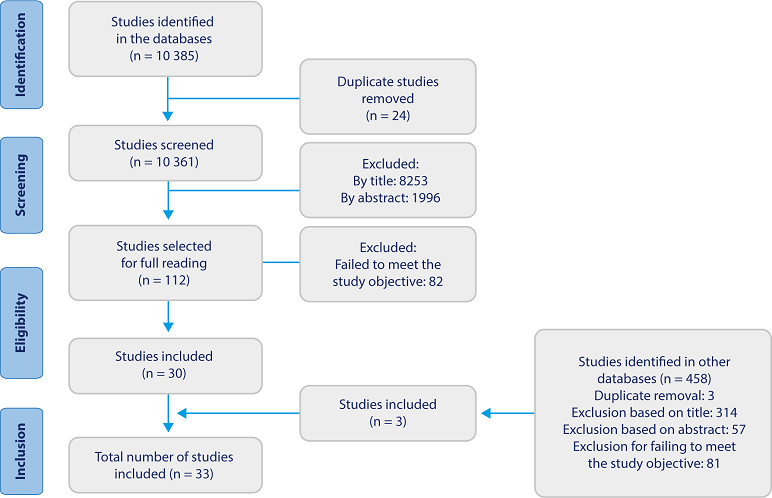 The final sample of studies that comprised the review were 33 studies. Of these, 31 were scientific articles, one was a master's thesis, and one was a doctoral dissertation. The following flowchart illustrates the sample collection process.