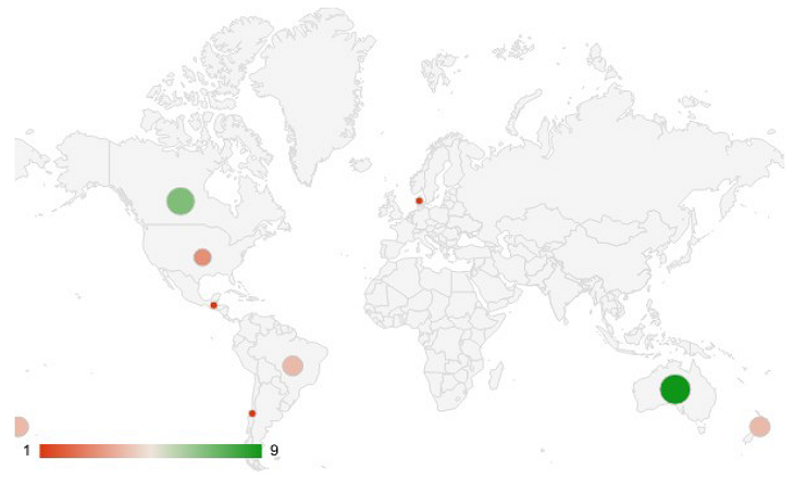 Regarding the countries where the studies were published, Australia was prominent, followed by some countries in the global North, as shown in Figure 3.
