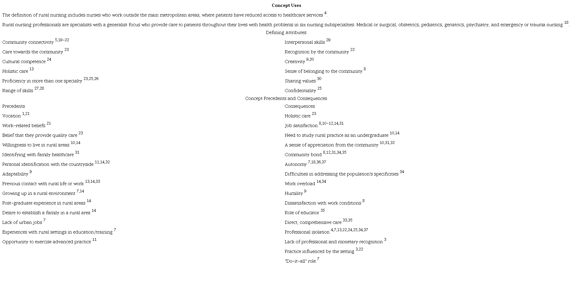 Conclusión: La correcta aplicación del concepto contribuye al establecimiento de la identidad profesional de las enfermeras rurales y al fortalecimiento de la enfermería como disciplina y ciencia, basada en la producción y avance del conocimiento.