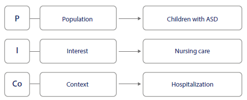 In the first stage, the research question was drafted-What are the dimensions of nursing care for hospitalized children with ASD?- using the PICo strategy, where 'P' stands for population, 'I' for interest of study, and 'Co' for context. Figure 1 shows how the strategy was organized.