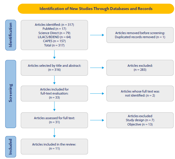 In the fourth stage, after applying the inclusion and exclusion criteria, 317 studies were found, of which one was excluded due to being a duplicate, yielding a total of 316 studies eligible for screening. After reading the titles and abstracts, 283 articles were excluded for not meeting the study criteria, resulting in 33 studies for full reading. Of these, two were excluded due to the unavailability of the full text, and 31 articles were assessed in full. Finally, a total of 11 studies were included in the review. The Prisma diagram was used to accurately represent all the stages of the selection process.