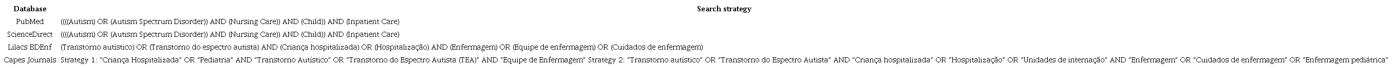 During this stage, the search strategy was reviewed by specialists in this field to ensure the coverage and adequacy of the terms used. We relied on the collaboration of researchers with experience in the reviewed subject, including the nurse researchers present in the study, who have expertise in providing care for children with ASD, to evaluate whether the descriptors, synonyms, and Boolean operators selected allowed the retrieval of the most relevant studies.