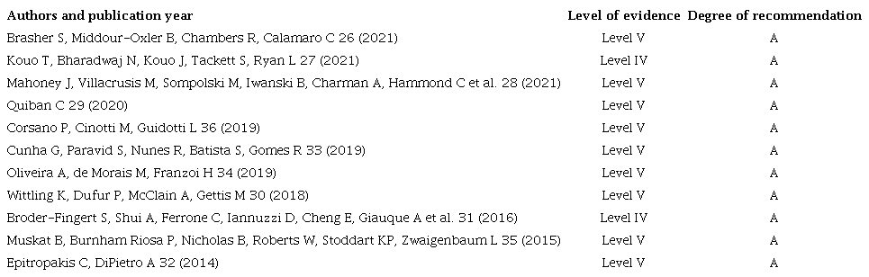 Then, the studies were classified according to the levels and degrees of recommendation 24, with the following levels of evidence: i) Systematic review; ii) Randomized clinical trial; iii) Cohort; iv) Case-control; v) Case series; vi) Specialist opinions; vii) Pre-clinical studies (animals/in vitro). In terms of the degree of recommendation, it is classified as: i) The result recommends the intervention; b) The result is inconclusive -not enough to confirm the hypothesis; c) The result contraindicates the intervention (Table 4).