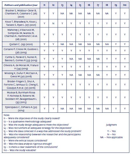 The studies were classified in terms of methodological quality via the Critical Appraisal Skills Programme (Casp) tool, a specific scale for qualitative studies. This tool contains 10 items related to study design and results and is divided into three sections: A, B, and C 23. In addition, the scientific evidence was classified according to the levels and degrees of recommendation proposed by Bork 24.