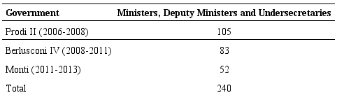 The time span analyzed covers the period from 2006 to 2013. In these seven years, three governments, with three different political outlooks, were successively in office. The first was the center-left Prodi II government, in office from 17 May 2006 to 8 May 2008. It was followed by the center-right Berlusconi IV government, in office from 8 May 2008 to 16 November 2011, and finally, from 16 November 2011 to 28 April 2013, by the “technical” (i.e. non-partisan) government headed by Monti. Therefore, a cabinet composed mainly by experts without a political affiliation followed two cabinets with different political orientations.