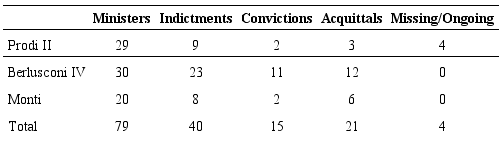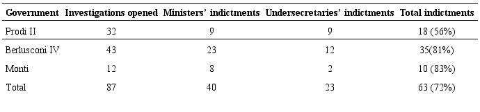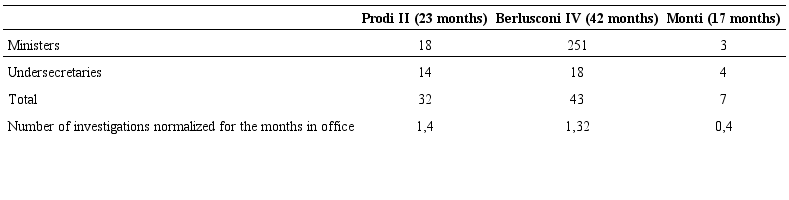 2 Here we considered also the 11 investigations against Berlusconi, leading to a total of 54 investigations. The other members subject to more than one investigation for corruption related charges were 7 in the Prodi II cabinet (5 Ministers and 1 Undersecretaries) 9 (6 Ministers and 2 Undersecretaries) in the Berlusconi IV cabinet and none in the Monti Cabinet.