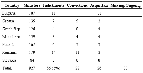 The results of our analysis highlight the high level of judicial activism in Italy. It is therefore confirmed the trend emerged since the “Mani pulite” scandals in 1993-1994 (Sberna and Vannucci 2013; Mungiu-Pippidi 2018). In fact, in the period here considered (2006-2013) 60 cabinet officials out of 240 have been investigated (see table 2), with a total of 82 investigations. When compared with the seven Eastern European countries analyzed by Popova and Post (2018) the Italian data seem to show a higher propensity by Italian courts to indict and try high-level politicians (see table 5). The data are even more significant if the high number of investigations not leading to an indictment is taken into account, also because it is likely that the data gathered have underestimated the real number of investigations.15 In any case, the news that some high level politician is under judicial investigation cannot but have a significant impact on his16 reputation and therefore on his political career.