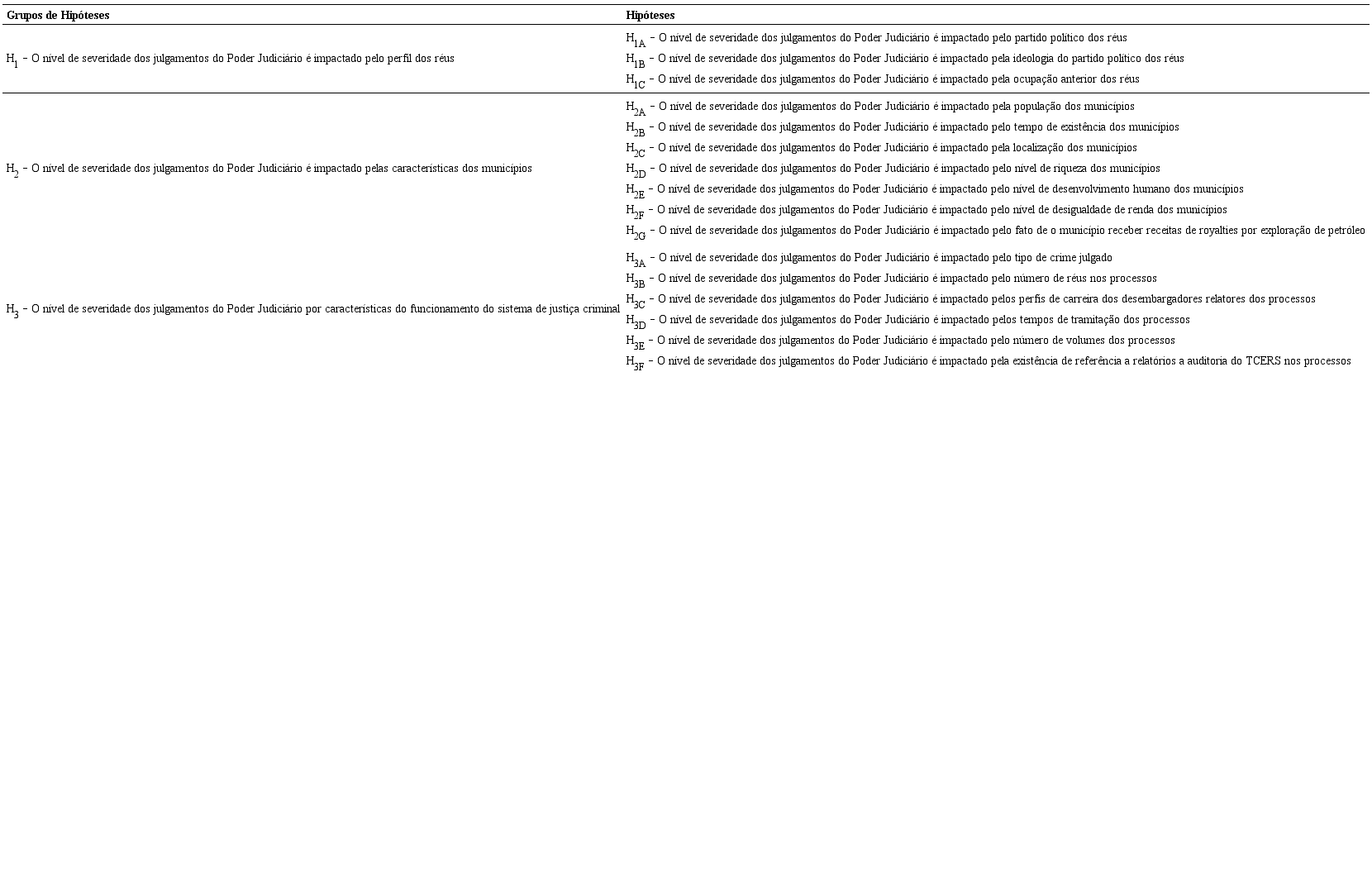 Em vista disso, propomos desagregar os dados ao máximo, adotando cada uma das decisões judiciais individualizadas por réu como unidades de análise da pesquisa. Assim, subscrevemos a uma perspectiva “individual” do problema de pesquisa proposto, abrindo espaço para o uso de métodos quantitativos e de técnicas multivariadas, de forma a complementar as análises já existentes. Para isso, desenvolvemos as hipóteses abaixo, que se originam tanto de adaptações de hipóteses oriundas de pesquisas ecológicas sobre o tema como de estudos sobre comportamento judicial em casos de judicial review, área em que predominam abordagens individuais.16 Elas podem ser classificadas em três grupos, relativas: i) ao perfil do réu; ii) às características dos municípios; e iii) ao funcionamento do sistema de justiça criminal.