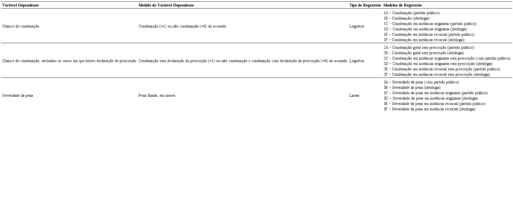 As hipóteses acima foram testadas por meio de técnicas multivariadas. O teste relativo à incidência ou não condenação dos acusados foi realizado por meio de regressão logística múltipla e o teste relativo ao tamanho das penas aplicadas foi feito por meio de regressão linear de mínimos quadrados ordinários. De forma a evitar a multicolinearidade entre as variáveis independentes, elaboramos uma matriz de risco com todas as variáveis independentes e adotamos coeficientes de correlação de Pearson superiores a 0,9 como critério para exclusão de variáveis, indicando alta correlação.21 A partir disso, dada a alta correlação entre variáveis “partido político de centro” e “MDB” (=0,908), as variáveis relativas ao partido político do réu e sua ideologia foram incluídas em modelos distintos, discutidos a seguir. As demais variáveis não apresentaram correlação acima dos níveis aceitáveis. De igual forma, para fins de operacionalização, os modelos multivariados omitem ao menos uma variável de cada conjunto de variáveis dummy, de modo a evitar multicolinearidade perfeita. Ainda, levando em consideração as excepcionalidades de se processar os casos como instância originária (quando as ações são julgadas pela 4CC quando os prefeitos ainda estão no exercício dos cargos) ou instância recursal (quando as ações são julgadas pela 4CC quando os prefeitos não ocupam mais os cargos e são, portanto, ex-prefeitos), desenvolvemos modelos para cada um desses tipos de processos. Dito isso, os modelos utilizados e suas respectivas variáveis dependentes estão na tabela 2.