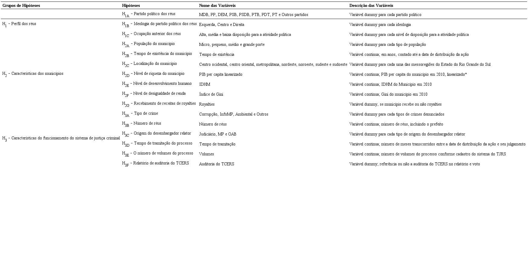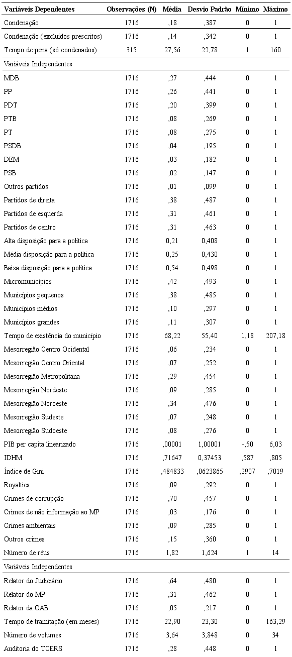 Quanto às variáveis independentes, várias estavam disponíveis na própria decisão da 4CC. Essas incluem o tipo de crime, o tempo de tramitação, o número de volumes e de réus, e a referência à auditoria do TCERS, integrantes do terceiro grupo de hipóteses. Para as demais variáveis, foram utilizadas consultas a bases públicas de informação, todas on-line. Esse foi o caso dos perfis dos desembargadores relatores (consultados no sítio eletrônico do TJRS), dos partidos políticos dos prefeitos municipais (consultados no sítio eletrônico do Tribunal Superior Eleitoral, que reúne informações sobre os então candidatos), das ideologias dos partidos (classificadas a partir de Rodrigues [2002]), da população, tempo de existência, localização, nível de riqueza, de desigualdade de renda e de desenvolvimento humano dos municípios (obtidos em consulta aos sítios eletrônicos da Fundação de economia e estatística do estado do Rio Grande do Sul e do Instituto Brasileiro de Geografia e Estatística), e do recebimento de royalties pelos municípios (obtido a partir de consulta no sítio eletrônico da Agência Nacional do Petróleo, Gás e Biocombustíveis). O quadro 1 complementa a tabela 1 e detalha tanto os nomes das variáveis como a sua operacionalização.