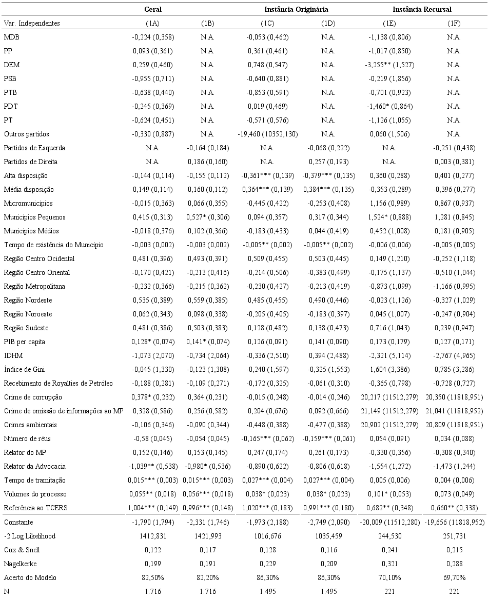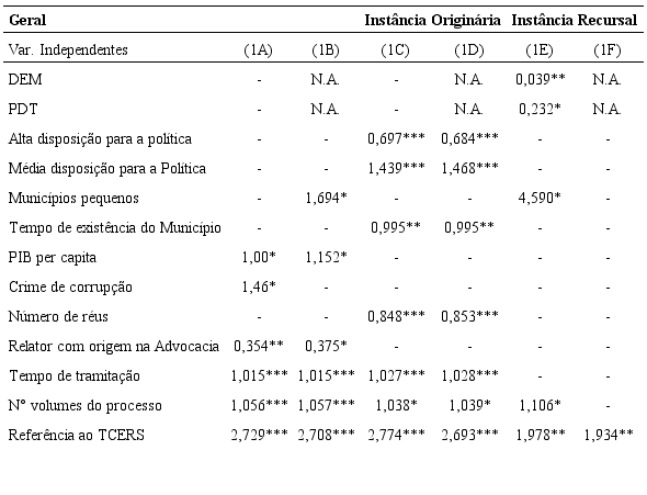Com efeito, apenas uma variável resultou estatisticamente significativa em todos os modelos testados: a presença de relatório de auditoria do TCERS nos municípios, que incrementa as chances de condenação dos prefeitos. Outras variáveis apresentam impacto semelhante a essa. O número de volumes do processo, que está associado ao incremento das chances de condenação dos acusados, é significativo em cinco modelos. O tempo de duração dos casos, também associado ao aumento das chances de condenação dos réus, é significativo em quatro modelos. Ainda, outras variáveis aparecem significativas apenas nos modelos gerais (1A e 1B). Esse é o caso do nível de desenvolvimento econômico (associada positivamente às chances de condenação, em contrariedade à hipótese inicial) e ao perfil do relator do caso, em que desembargadores oriundos da advocacia reduzem as chances de condenação dos réus, comparativamente a desembargadores oriundos da própria magistratura, os quais apresentam comportamento estatisticamente indistinguível de relatores com carreira no Ministério Público. Algumas variáveis são significativas somente nos modelos dos casos julgados em instância originária (1C e 1D). Aqui se incluem todas as variáveis associadas à ocupação dos réus. No caso, prefeitos com média disposição para atividade política possuem a maior chance de condenação, seguidos por prefeitos com baixa disposição para atividade política e, finalmente, por prefeitos com alta disposição para política. Ainda em relação a esses modelos, os resultados indicam que o tempo de existência do município e o número de réus estão ambos negativamente associados às chances de condenação. A variável relativa ao tamanho dos municípios resultou estatisticamente significativa apenas para os de pequeno porte, que possuem suas chances de condenação aumentada em relação aos municípios grandes em dois tipos de modelos distintos, um geral (1B) e outro relativo apenas aos casos julgados como instância recursal (1E). De forma menos promissora, outras variáveis resultaram significativas em apenas um dos seis modelos testados. Essas são o tipo de crime (apenas crimes de corrupção no modelo 1A, aumentando as chances de condenação), e os partidos dos prefeitos (DEM e PDT no modelo 1E, reduzindo as chances de condenação). Por último, algumas variáveis não resultaram estatisticamente significativas em nenhum dos modelos testados. Esse é o caso das variáveis: ideologia dos partidos dos prefeitos, localização dos municípios, nível de desigualdade de renda e de desenvolvimento humano dos municípios e recebimento de royalties.