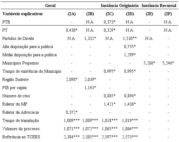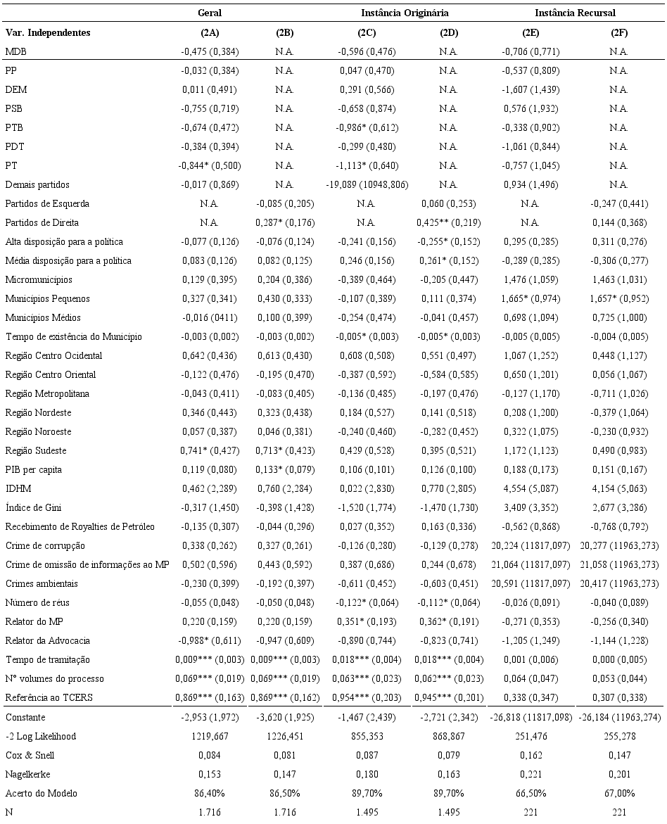 Em complemento à análise anterior, a tabela 6 altera a forma de mensuração da variável dependente, classificando como positivos (=1) apenas os casos em que ocorreu condenação sem a declaração de prescrição e como negativos (=0) todos os demais. Isso reduz o total de condenações de 315 para 236 e afeta parcialmente as conclusões acima. Particularmente, ao introduzir essa nova maneira de medir a incidência de condenações, um conjunto relativamente menor de variáveis se mostra estatisticamente significativo e nenhuma delas se apresenta assim em todos os modelos testados. Tal como no anterior, nos casos julgados em instância recursal há um conjunto ainda menor de variáveis aptas a explicar os resultados: apenas uma variável, relativa aos municípios de pequeno porte, aparece estatisticamente significativa nos modelos 2E e 2F, e com nível de significância igual a 0,10. Em sentido semelhante à análise anterior, e ainda que nenhuma possa ser apontada como significativa em todos os modelos, as variáveis mais promissoras são as relativas ao funcionamento das instituições do sistema de justiça e, dentre essas, aquelas relacionadas à produção de prova – número de volumes, tempo de tramitação e referência à auditoria do TCERS realizada no município. Essas figuram estaticamente significativas em quatro dos seis modelos testados (2A a 2D). Em reforço a esse grupo de hipóteses, também nesses modelos o número de réus e a origem do desembargador relator do caso no Ministério Público resultaram estatisticamente significativas em dois modelos (2C e 2D), ainda que com significância estatística apenas ao nível de 0,10. Diferentemente dos anteriores, nesses modelos algumas variáveis relativas ao partido político dos prefeitos e à sua ideologia resultaram significativas com maior frequência, ainda que ao nível de 0,10. A variável relacionada ao Partido dos Trabalhadores (PT) aparece associada à redução das chances de ocorrer condenação sem a declaração de prescrição em dois dos três modelos possíveis para essa variável (2A e 2C). Já os prefeitos de partidos de direita apresentaram maiores chances de condenação em dois dos três modelos possíveis (1B e 1D). Em relação às características dos municípios, o tempo de existência dos municípios e a sua localização na região Sudeste do Estado figuram estatisticamente significativas em dois modelos cada e ao nível de 0,10. Por fim, outras variáveis resultaram significativas em apenas um modelo testado, praticamente todas ao nível de 0,10, conferindo reduzida confiabilidade à significância teórica das hipóteses subjacentes a essas variáveis.