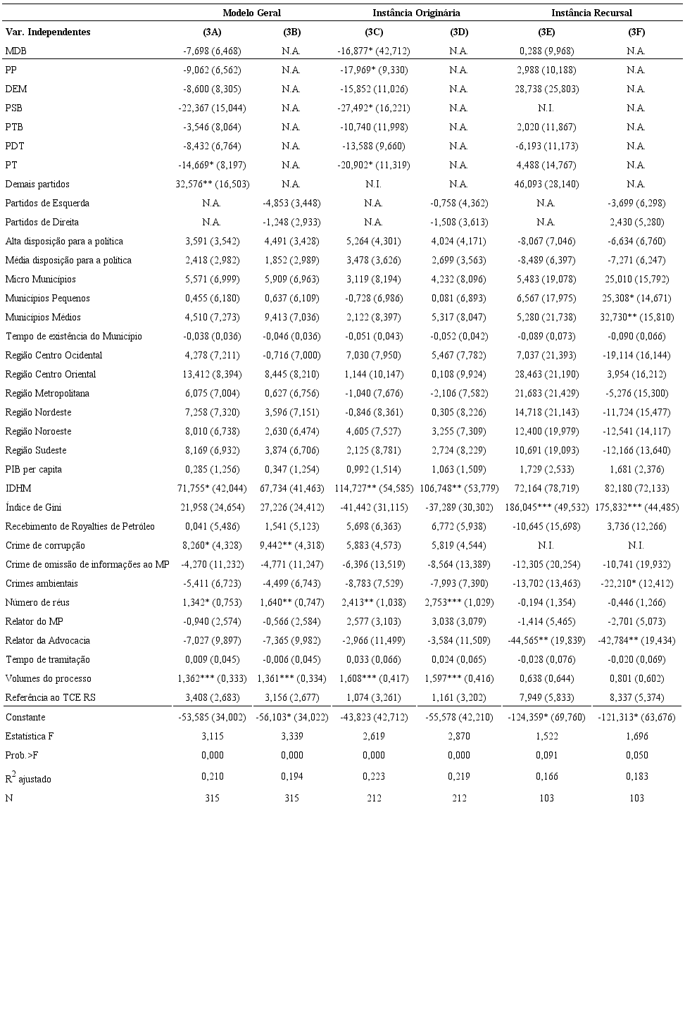 Finalmente, testamos o comportamento decisório da 4CC em relação à dosimetria das penas de detenção e de reclusão. No caso, o modelo quantitativo empregado é linear de mínimos quadrados ordinários e avalia o efeito das variáveis explicativas sobre o tempo de pena aplicada aos prefeitos e aos ex-prefeitos condenados. Novamente, o comportamento da 4CC em casos decididos como instância recursal difere bastante dos demais, havendo pouquíssimas variáveis estatisticamente significativas. Nos modelos 3E e 3F, apenas as variáveis relativas ao desembargador relator com origem na advocacia e ao nível de desigualdade social resultaram estatisticamente significativas em ambos. A primeira está associada à redução da pena de 42 a 44 meses, e a segunda está associada ao aumento da pena, de modo que incremento de 0,1 no índice de Gini no julgamento de ex-prefeitos está associado a um incremento de 17,5 a 18,6 meses de pena. Com efeito, especialmente por conta dos resultados dos modelos 3E e 3F, inexiste variável que seja estatisticamente significativa em todos os seis modelos testados.