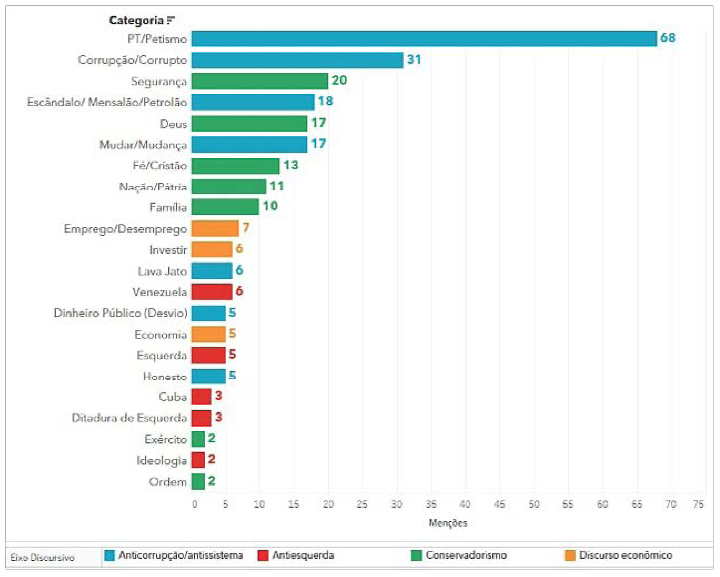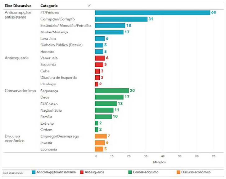 Quando analisamos o HGPE de Bolsonaro, encontramos elementos semânticos que se relacionam com as demandas de seu diverso eleitorado. Metodologicamente combinamos as perspectivas quantitativa e qualitativa para analisar os conteúdos dos programas veiculados.15 Após a transcrição dos programas eleitorais, delimitamos categorias representativas do léxico bolsonarista, compondo quatros eixos: anticorrupção/antissistema, conservadorismo, economia, anti-esquerda. Com vistas a dar a dimensão do debate sobre a corrupção no HGPE, associamos as categorias aos eixos, a partir de uma análise do contexto do seu uso. Realizamos, também, um levantamento quantitativo da recorrência de cada categoria por eixo (gráfico 1); um comparativo da recorrência entre todas as categorias (gráfico 2); e produzimos uma nuvem de palavras que apresenta a dimensão das categorias de cada eixo (figura 1).
