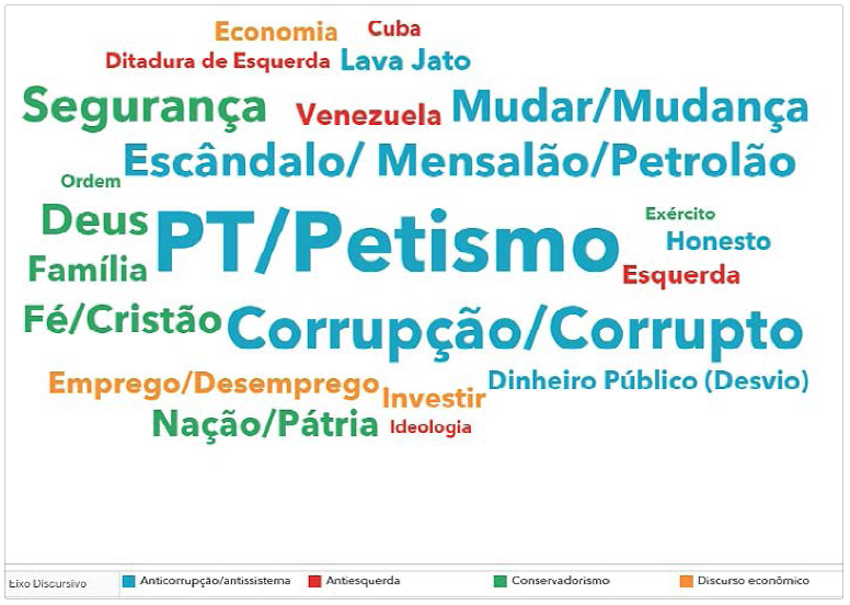 Ao longo do artigo, analisamos como o conteúdo produzido pela campanha de Bolsonaro, no 2.° turno, incorporou a narrativa lavajatista. O petismo como sinônimo de corrupção e sistema foi o enquadramento interpretativo mais mobilizado, demonstrando a transversalidade argumentada por Gomes (2020) na composição do poliedro eleitoral. Ao observarmos as expressões com maior recorrência e seus contextos de uso no HGPE, encontramos o discurso anticorrupção como par do discurso antissistema, tendo como destaque categorias antipetistas: PT/Petismo, Corrupção/Corrupto, Escândalo/Mensalão/Petrolão.