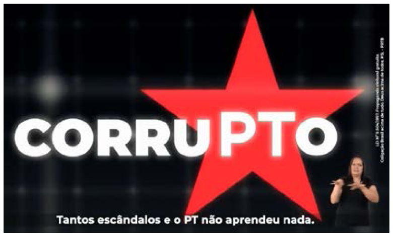 A associação antipetismo e anticorrupção percorre todos os programas eleitorais do segundo turno. Nesse enquadramento interpretativo há dois pontos altos: 1) uma afirmação feita pelo locutor off no último programa que diz: “O PT desafia o judiciário. Eles querem soltar o presidiário [Lula] e não sair mais do poder. Agora é o Brasil contra a corrupção. Agora é o Brasil contra o PT”;23 e 2) a imagem (figura 2) que traz o símbolo do PT inscrito na palavra corrupto.