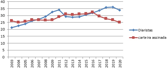 Os impactos gerados pela pandemia no trabalho doméstico foram potencializados por processos precarizantes que já vinham em curso (Lima e Prates 2019), resultantes de um cenário de crise econômica e avanço de políticas neoliberais, a exemplo da Reforma Trabalhista, que retira e flexibiliza direitos das trabalhadoras e trabalhadores das mais diversas categorias ( Krein 2018). Conforme observamos no gráfico, a partir de 2016 há uma quebra do movimento positivo gerado pela nova legislação do trabalho doméstico, com queda drástica da taxa de trabalhadoras com carteira de trabalho assinada e o aumento do trabalho em vínculo diário.